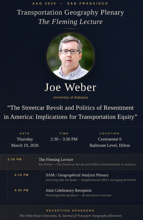 - 2:30 pm: Transportation Geography Plenary: Fleming Lecture by Joe Weber